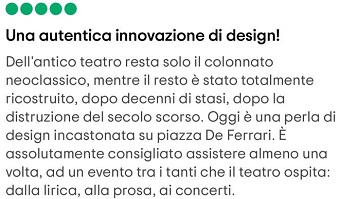 Tanti i pareri positivi sul Teatro Carlo Felice, polo d’arte e cultura nel centro di Genova, apprezzato per la sua bellezza ma soprattutto per l’ampia offerta di spettacoli che propone.